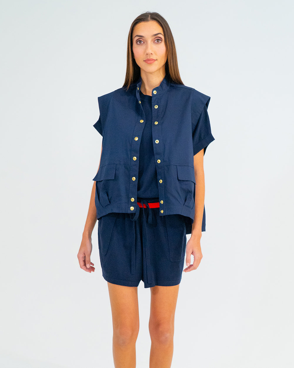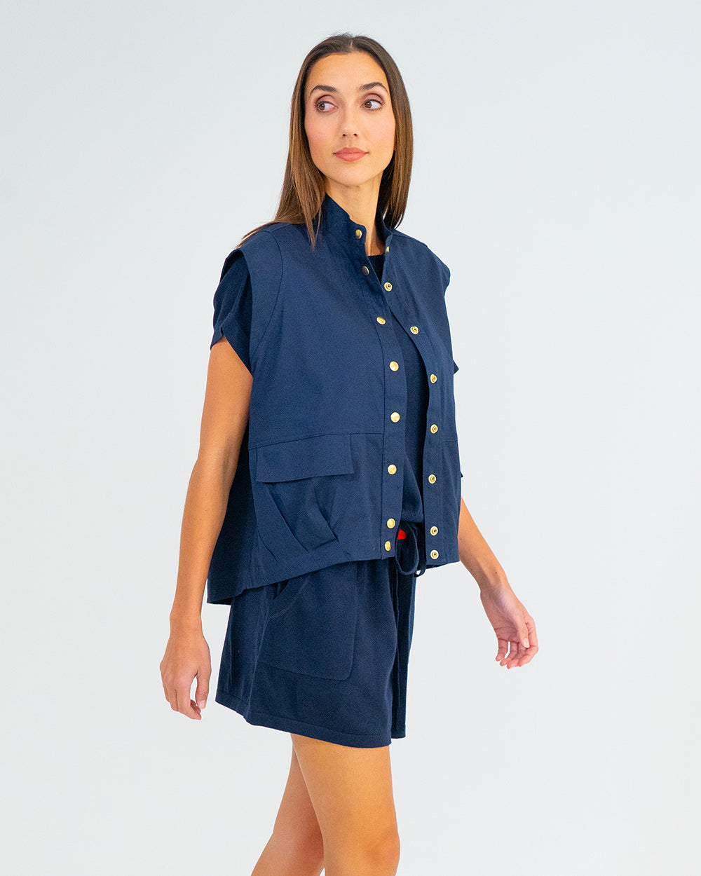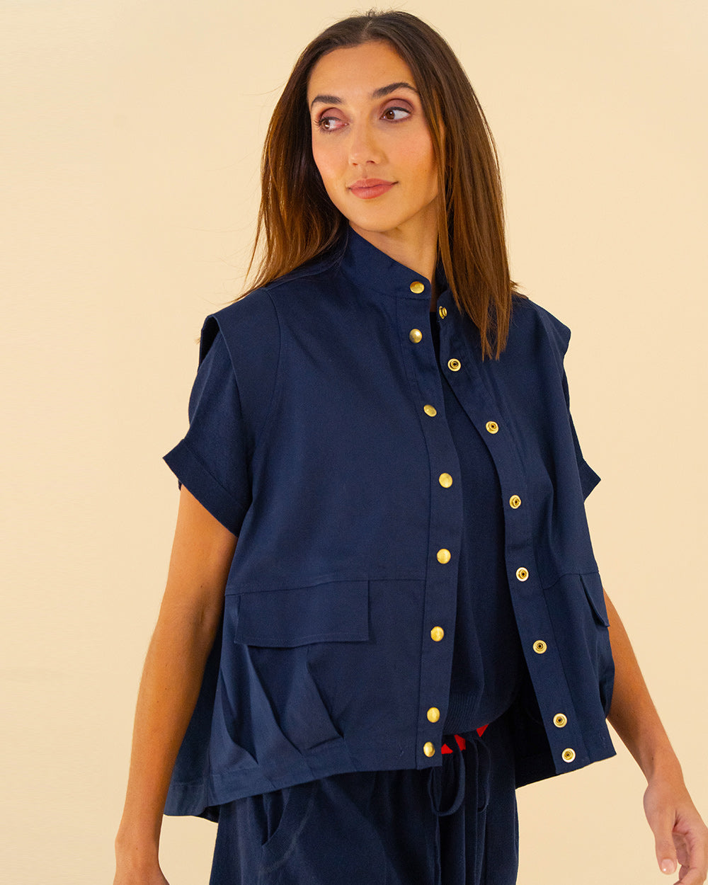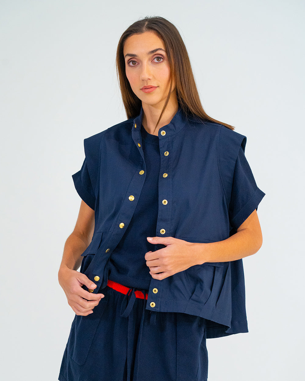 The Clare Vest mixes utilitarian vibes with effortless style. Made from crisp, cool 100% cotton, it’s perfect for layering. The oversized fit keeps things comfy, while gold snap studs and an elastic drawcord with gold toggle add a polished finish. Pairs perfectly with the Evelyn Skirt for a matching set, or style it over a classic tee with jeans.