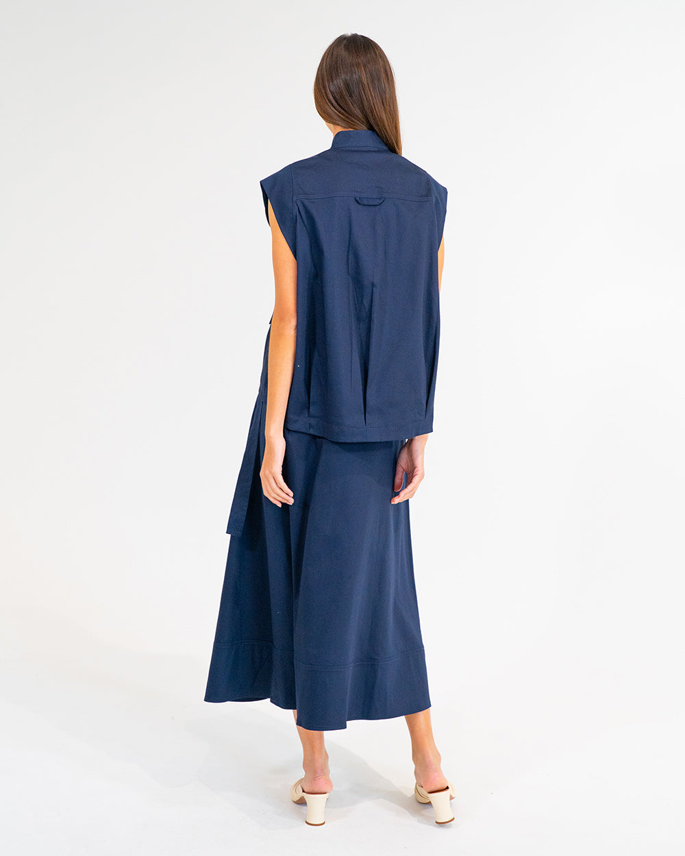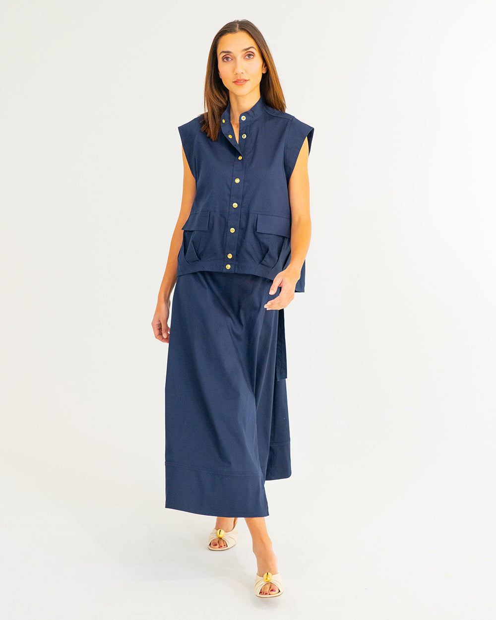 The Evelyn Skirt blends classic design with modern touches. Made from crisp, cool 100% cotton, it’s perfect for all-day comfort. The A-line wrap shape features topstitching on the waistband and luxe gold hardware. Dress it up with a blouse or keep it casual with a tee. We love it paired with the Clare Vest.