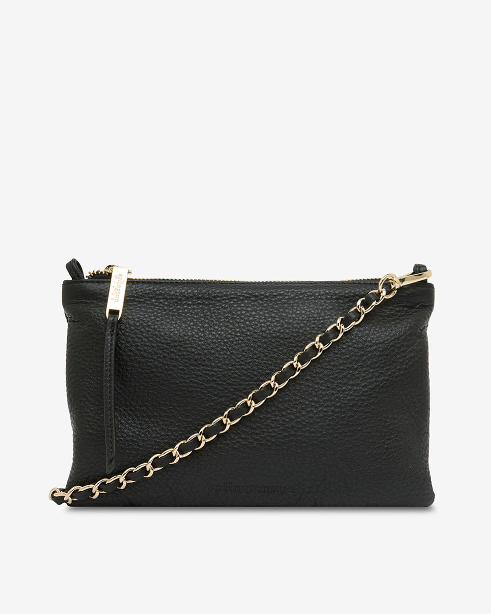 The Arlington Milne Molly Crossbody is crafted from premium pebble leather. The soft bodied, compact crossbody bag features light gold hardware, an embossed logo and two strap options. The top zipper opens to an ample centre compartment featuring Arlington Milnes signature hot pink lining.
